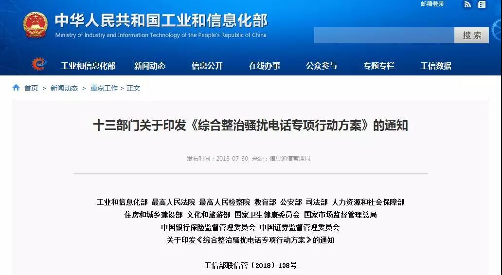 當(dāng)前,營銷電話擾民、惡意電話騷擾等問題日益突出,嚴(yán)重影響人民群眾正常生活。日前,工業(yè)和信息化部、住房城鄉(xiāng)建設(shè)部等13個(gè)部門聯(lián)合印發(fā)《綜合整治騷擾電話專項(xiàng)行動(dòng)方案》,決定自2018年7…