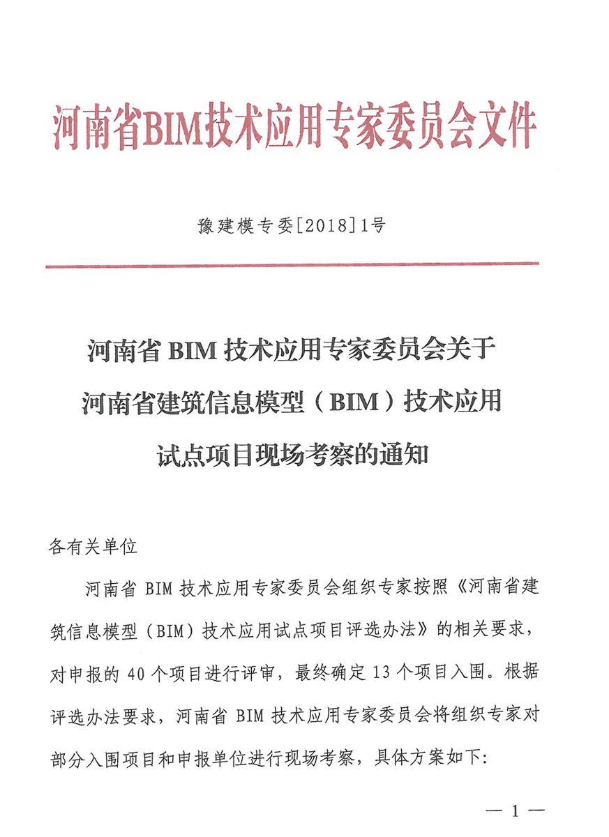 省BIM技術(shù)應(yīng)用專家委員會(huì)關(guān)于河南省建筑信息模型(BIM)技術(shù)應(yīng)用試點(diǎn)項(xiàng)目現(xiàn)場(chǎng)考察的通知