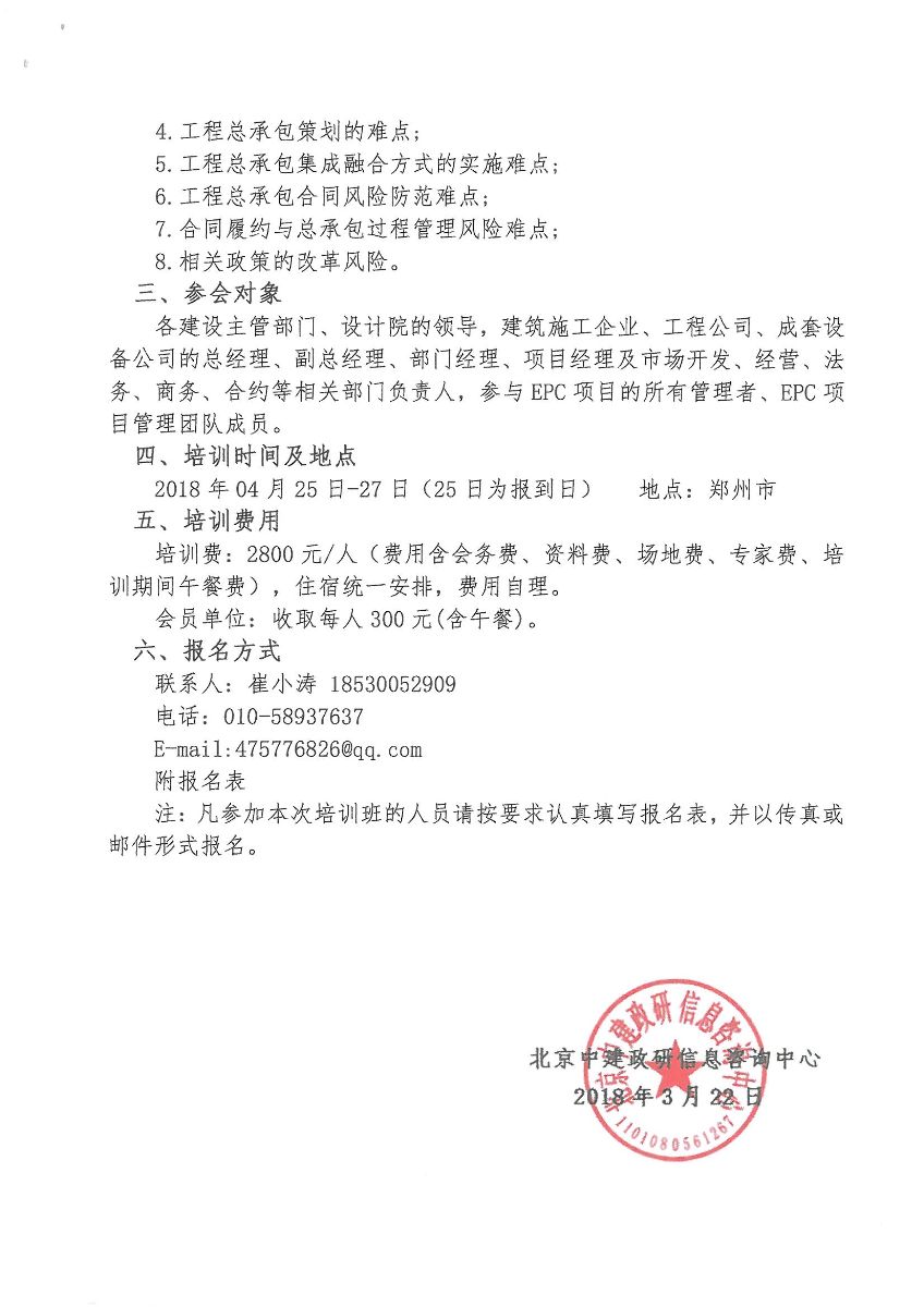 中建政研信息咨詢(xún)中心于4月25日-27日在鄭州舉辦“<房屋建筑和市政基礎(chǔ)項(xiàng)目工程總承包管理辦法>(征求意見(jiàn)稿)亮點(diǎn)介紹暨工程總承包疑難問(wèn)題解析專(zhuān)題培訓(xùn)”、5月17日-19日在鄭州舉辦“<招標(biāo)投標(biāo)法>大修、縮小工程招標(biāo)范圍暨行業(yè)難點(diǎn)問(wèn)題和經(jīng)典案例分析”,現(xiàn)將有關(guān)通知文件轉(zhuǎn)發(fā)給你們。