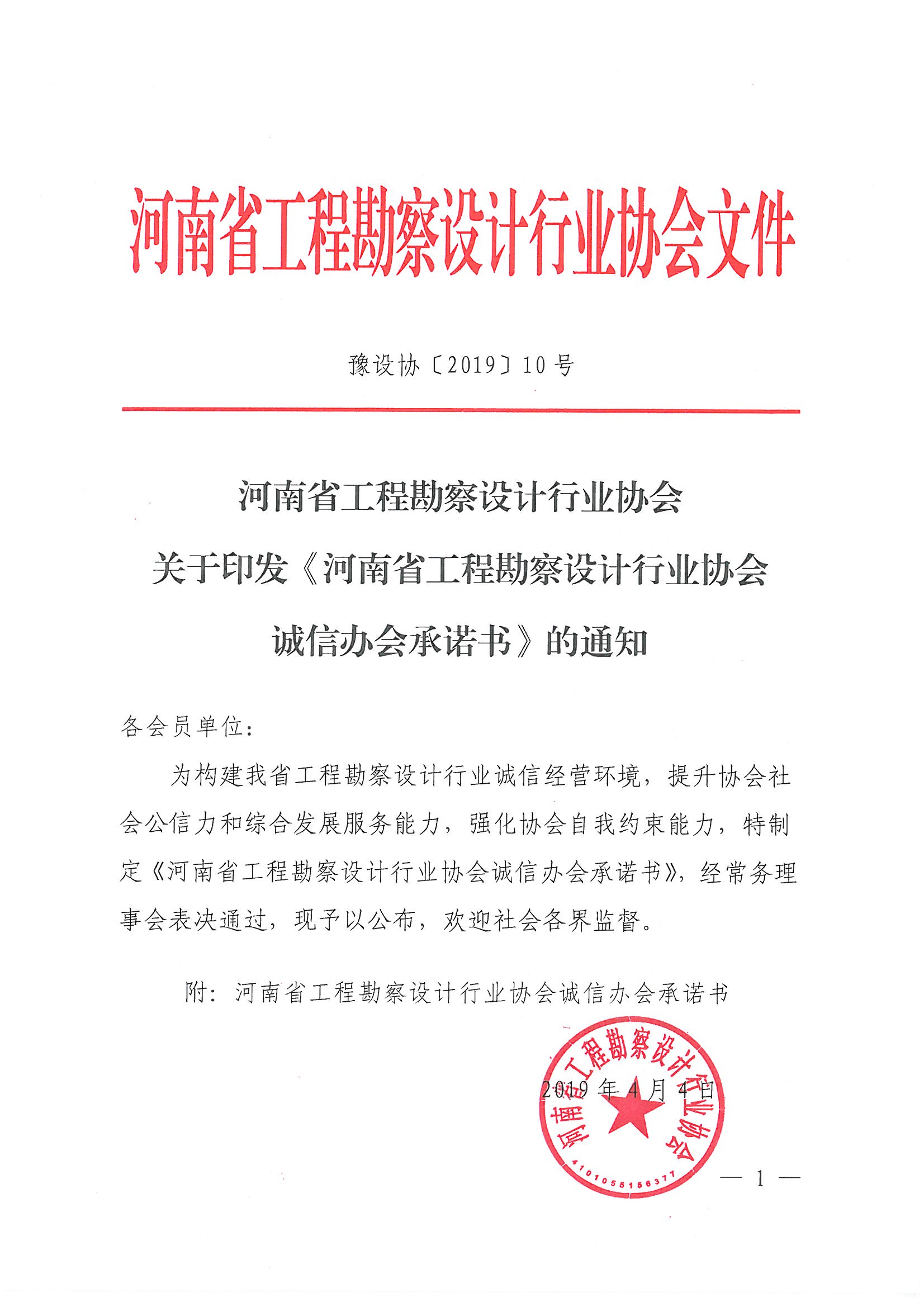 協(xié)會關(guān)于印發(fā)《河南省工程勘察設(shè)計行業(yè)協(xié)會誠信辦會承諾書》的》通知