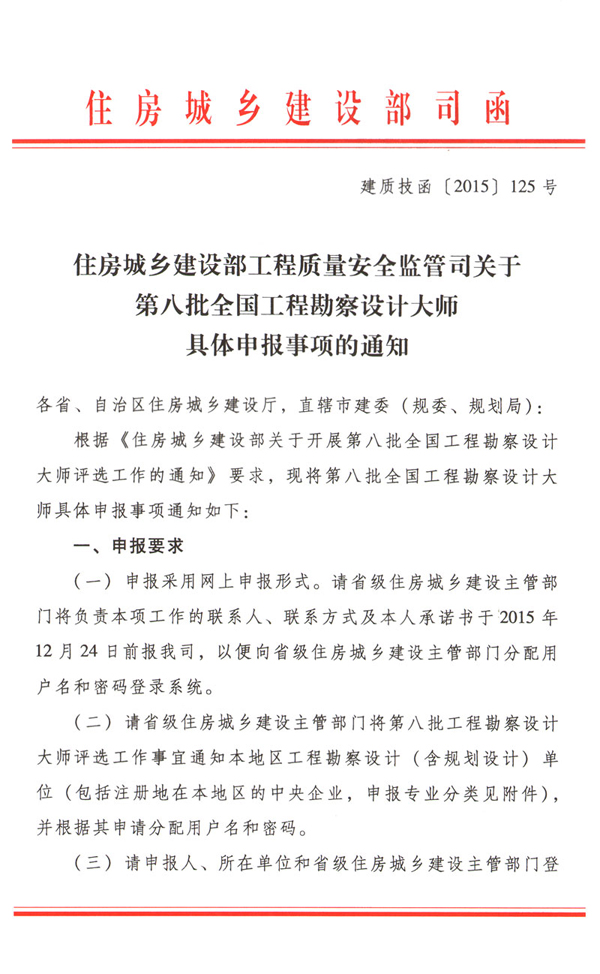 住房城鄉(xiāng)建設(shè)部工程質(zhì)量安全監(jiān)管司關(guān)于第八批全國(guó)工程勘察設(shè)計(jì)大師具體申報(bào)事項(xiàng)的通知