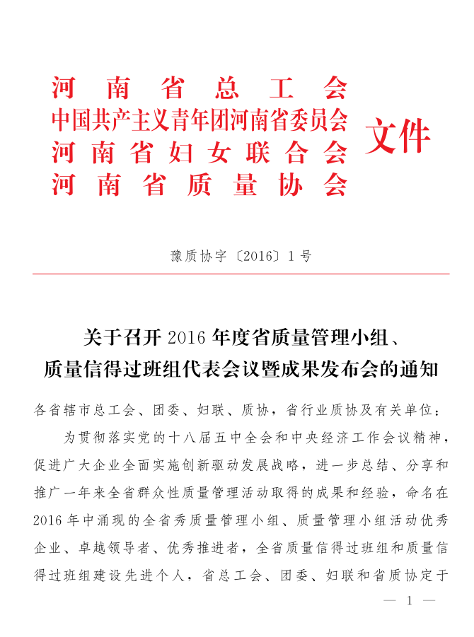 關于召開2016年度省質量管理小組、質量信得過班組代表會議暨成果發(fā)布會的通知