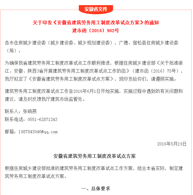 2016年4月11日,住房和城鄉(xiāng)建設部批準浙江、安徽、陜西3省開展建筑勞務用工制度試點工作方案,隨后安徽省、浙江省、陜西省陸續(xù)發(fā)布“建筑勞務用工制度改革試點方案”。