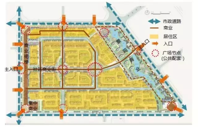 以文化廣場為中心,沿街道向周邊輻射商業(yè),形成核心公共空間,區(qū)分商業(yè)內(nèi)街與外街,結(jié)合水景排布沿河商業(yè),向住宅組團有所延伸,做了表面的開放。