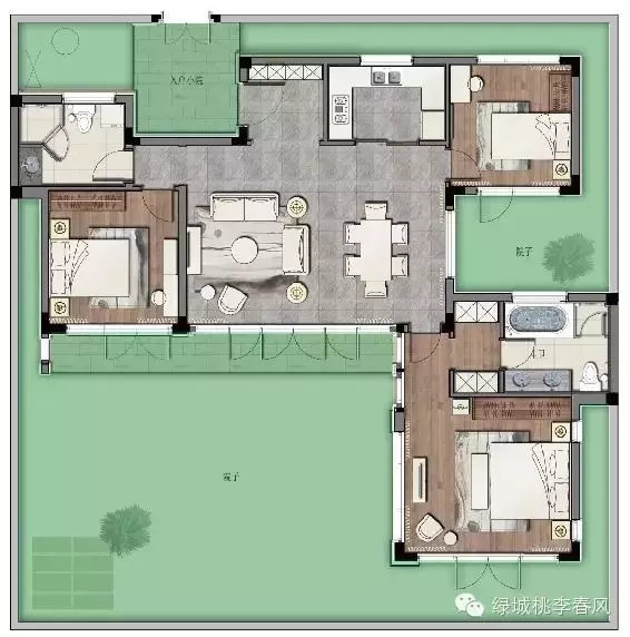 •兩廳三室均有院落環(huán)伺,一步之遙遠(yuǎn)悠然品茗、賞景,好不自在。