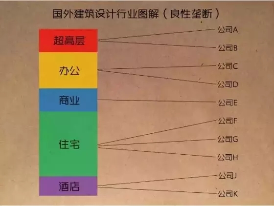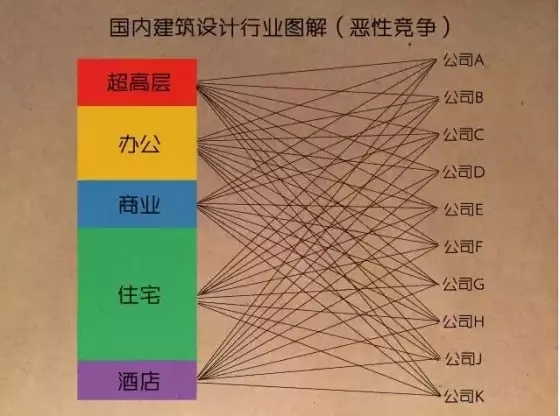 不可否認房地產(chǎn)行業(yè)為國內(nèi)建筑設(shè)計公司提供主要的業(yè)務(wù)來源。國內(nèi)房地產(chǎn)是資源導(dǎo)向型行業(yè),這導(dǎo)致房地產(chǎn)下游行業(yè)公司很難因為技術(shù)優(yōu)勢或者設(shè)計優(yōu)勢而占領(lǐng)市場,下游行業(yè)整體混亂,缺乏行業(yè)標(biāo)準(zhǔn)。建筑設(shè)計行業(yè)里的很多公司最后都從創(chuàng)意設(shè)計產(chǎn)業(yè)淪為了為房地產(chǎn)公司代工的低附加值的加工制造業(yè)。看看房地產(chǎn)其他下游行業(yè)吧,家裝、施工、建材行業(yè)幾乎都是混亂至極。國內(nèi)房地產(chǎn)行業(yè)排名第一的公司占市場份額1%都不到。這在其他以設(shè)計和技術(shù)導(dǎo)向型行業(yè)是不可想象的,2014年排名第一的大眾集團占國內(nèi)汽車市場份額18.7%。