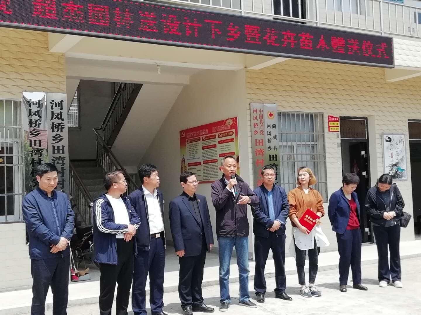 首先,郭風(fēng)春副廳長(zhǎng)一行在信陽(yáng)市城市管理執(zhí)法局局長(zhǎng)張立英,商城縣副縣長(zhǎng)程功言,商城縣紅十字會(huì)會(huì)長(zhǎng)盧慶,商城縣住建局穆正松局長(zhǎng)以及河鳳橋鄉(xiāng)黨委書記程欣然的陪同下,出席了“人禾景觀超杰園林送設(shè)計(jì)下鄉(xiāng)暨花卉苗木捐贈(zèng)儀式”。人禾景觀規(guī)劃設(shè)計(jì)河南有限公司和河南超杰園林設(shè)計(jì)工程有限公司是在省住房城鄉(xiāng)建設(shè)廳的組織發(fā)動(dòng)下,響應(yīng)黨和國(guó)家的號(hào)召,積極關(guān)心支持田灣村的脫貧攻堅(jiān)工作和美麗鄉(xiāng)村建設(shè)。在3月底為田灣村進(jìn)行義務(wù)園林化規(guī)劃設(shè)計(jì)的基礎(chǔ)上,今天又無(wú)償捐獻(xiàn)了1200株百日紅,730株櫻花,70斤的格桑花籽和月季等花卉苗木,總價(jià)值約6萬(wàn)元。儀式上,郭風(fēng)春副廳長(zhǎng)和程功言副縣長(zhǎng)為兩個(gè)公司頒發(fā)了捐贈(zèng)證書,并對(duì)他們的善舉進(jìn)行了勉勵(lì)。在簡(jiǎn)短儀式后,郭風(fēng)春副廳長(zhǎng)和大家一起在田灣新村主干道邊栽下了百日紅。