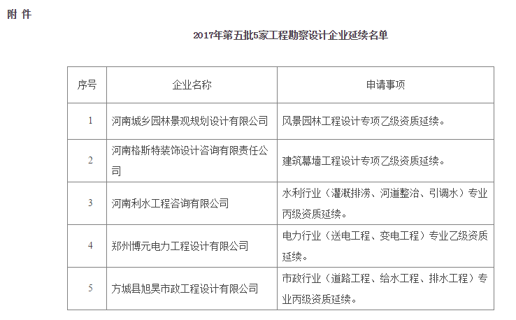 附件:2017年第五批5家工程勘察設(shè)計企業(yè)延續(xù)名單