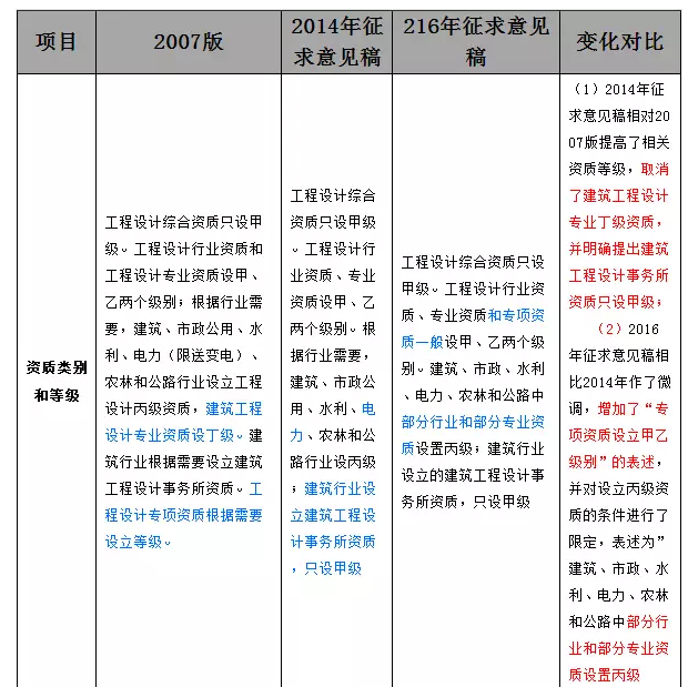 2016年征求意見(jiàn)稿與2007年印發(fā)的工程設(shè)計(jì)資質(zhì)進(jìn)行對(duì)比,總體上有這些變化: