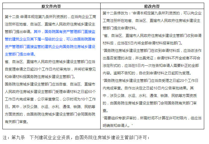 2、原文件中“其中,國務(wù)院國有資產(chǎn)管理部門直接監(jiān)管的建筑企業(yè)及其下屬一層級的企業(yè),可以由國務(wù)院國有資產(chǎn)管理部門直接監(jiān)管的建筑企業(yè)向國務(wù)院住房城鄉(xiāng)建設(shè)主管部門提出申請。” 內(nèi)容被刪除,這或?qū)⒁馕吨肫笕绲胤狡髽I(yè)一樣須向企業(yè)工商注冊所在地省、自治區(qū)、直轄市人民政府住房城鄉(xiāng)建設(shè)主管部門提交申請材料。