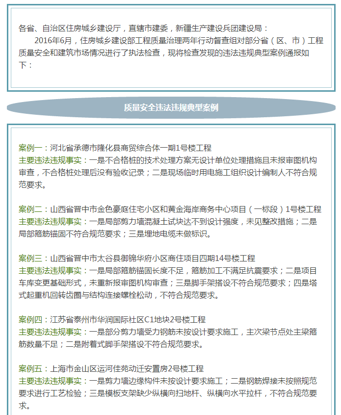 住建部最新通報(bào)2016年工程質(zhì)量治理兩年行動(dòng)違法違規(guī)典型案例
