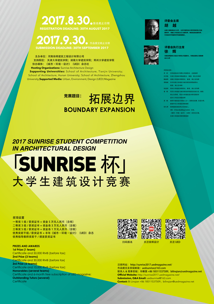 由河南徐輝建筑工程設(shè)計(jì)有限公司主辦的“SUNRISE杯大學(xué)生建筑設(shè)計(jì)方案競(jìng)賽”始于2011年,每?jī)赡暌粚谩C繉靡援?dāng)下深具前瞻性的專業(yè)議題為主題,緊扣時(shí)代發(fā)展脈搏,關(guān)注國(guó)計(jì)民生,致力于培養(yǎng)具有優(yōu)秀建筑思維及社會(huì)責(zé)任感的建筑學(xué)子,培養(yǎng)和引領(lǐng)中國(guó)建筑界的新生力量,促進(jìn)建筑領(lǐng)域蓬勃發(fā)展。此外,每屆競(jìng)賽均邀請(qǐng)國(guó)內(nèi)著名的建筑大師擔(dān)任評(píng)委會(huì)主席,并邀請(qǐng)國(guó)內(nèi)知名建筑師及高校院長(zhǎng)擔(dān)任評(píng)委,經(jīng)過(guò)三屆的推行,得到了全國(guó)各大建筑高校師生們的積極參與和關(guān)注。
