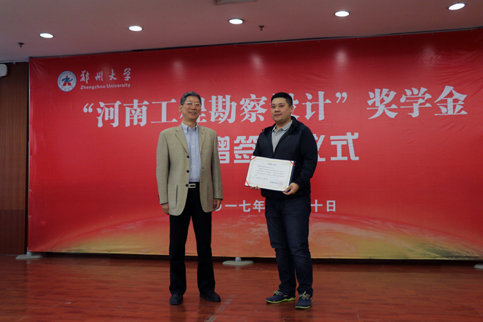 4月20日,“河南工程勘察設(shè)計(jì)”獎(jiǎng)學(xué)金簽約儀式在鄭大校園舉行。河南省城鄉(xiāng)建筑設(shè)計(jì)院有限公司是捐資企業(yè)之一,該院經(jīng)營部主任張鑫上臺領(lǐng)取捐贈證書。
