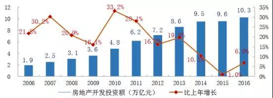 隨著供給側(cè)結(jié)構(gòu)性改革不斷深化,2015年全國(guó)房地產(chǎn)開(kāi)發(fā)完成投資比上年僅增長(zhǎng)1%,投資規(guī)模近9.6萬(wàn)億元,基本與上年持平。進(jìn)入2016年投資形勢(shì)有所好轉(zhuǎn),全年房地產(chǎn)開(kāi)發(fā)投資10.3萬(wàn)億元,比上年增長(zhǎng)6.9%,但與上年同期相比投資增長(zhǎng)均未過(guò)10%。