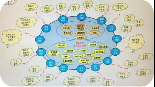 北京中設(shè)認(rèn)證服務(wù)有限公司根據(jù)20年積累的工程勘察設(shè)計(jì)行業(yè)專業(yè)化審核經(jīng)驗(yàn),采用通用質(zhì)量管理體系要求與行業(yè)特殊要求相融合的AB模式,組織試點(diǎn)單位編制了《工程勘察設(shè)計(jì)行業(yè)質(zhì)量管理體系認(rèn)證標(biāo)準(zhǔn)》《工程勘察設(shè)計(jì)行業(yè)質(zhì)量管理體系分級認(rèn)證和評價(jià)標(biāo)準(zhǔn)》以及《整合管理體系認(rèn)證實(shí)施指南》。這些升級版標(biāo)準(zhǔn)是以GB/T19001《質(zhì)量管理體系要求》標(biāo)準(zhǔn)為基礎(chǔ),融入GB/T19004《追求組織的持續(xù)成功質(zhì)量管理方法》、GB/T19580《卓越績效評價(jià)準(zhǔn)則》的質(zhì)量管理標(biāo)準(zhǔn)和方法,并結(jié)合工程勘察設(shè)計(jì)行業(yè)標(biāo)桿企業(yè)在目標(biāo)管理、項(xiàng)目管理、風(fēng)險(xiǎn)管理、知識管理、信息化管理等方面的良好實(shí)踐經(jīng)驗(yàn),在影響勘察設(shè)計(jì)企業(yè)質(zhì)量管理效果的重點(diǎn)環(huán)節(jié)以及需要提升的、困惑的或容易出現(xiàn)問題的一些細(xì)節(jié),細(xì)化了評分標(biāo)準(zhǔn),然后通過認(rèn)證審核所獲得的分?jǐn)?shù)確定認(rèn)證級別(五星級、四星級、三星級)。分級認(rèn)證標(biāo)準(zhǔn)內(nèi)容包括:組織環(huán)境、領(lǐng)導(dǎo)作用、策劃、支持(人力資源、技術(shù)資源與知識管理、信息化、BIM及應(yīng)用、財(cái)務(wù)管理、文件及檔案管理、基礎(chǔ)設(shè)施及運(yùn)行環(huán)境)、運(yùn)行(工程勘察、工程咨詢設(shè)計(jì)、工程總承包、項(xiàng)目管理)、績效評價(jià)、改進(jìn)等10大過程,并將 “工程勘察設(shè)計(jì)管理要素云圖” (如下圖)體現(xiàn)的要求融入到了標(biāo)準(zhǔn)的設(shè)計(jì)中,制定了10大過程的分解評分標(biāo)準(zhǔn),目的是提高全要素生產(chǎn)力。