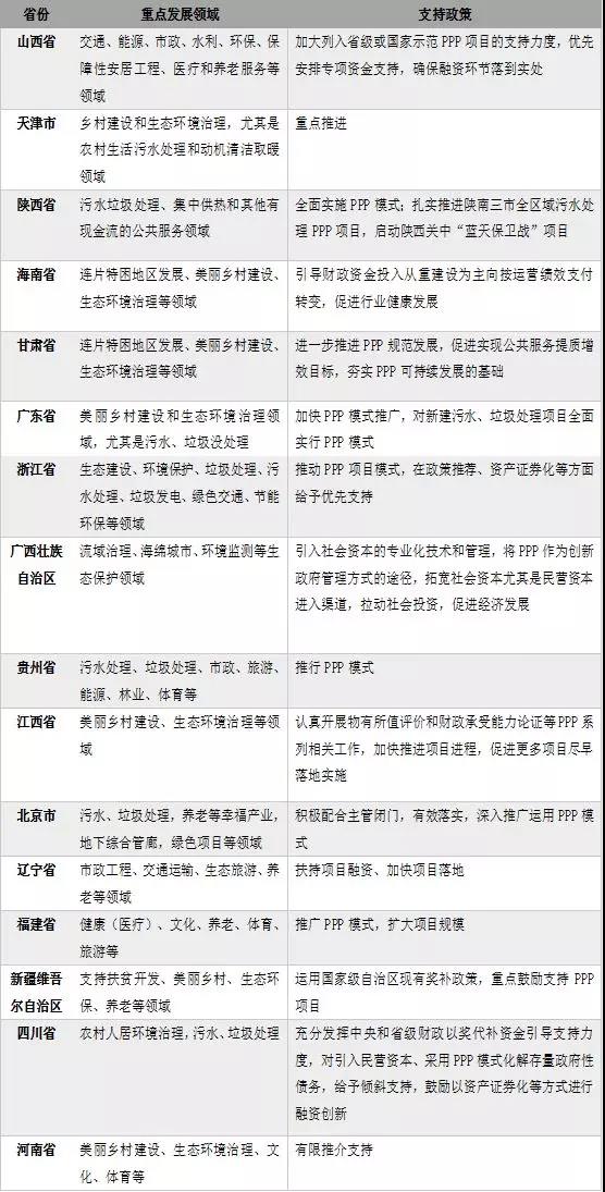 表1 各省PPP重點(diǎn)發(fā)展領(lǐng)域和相關(guān)支持政策