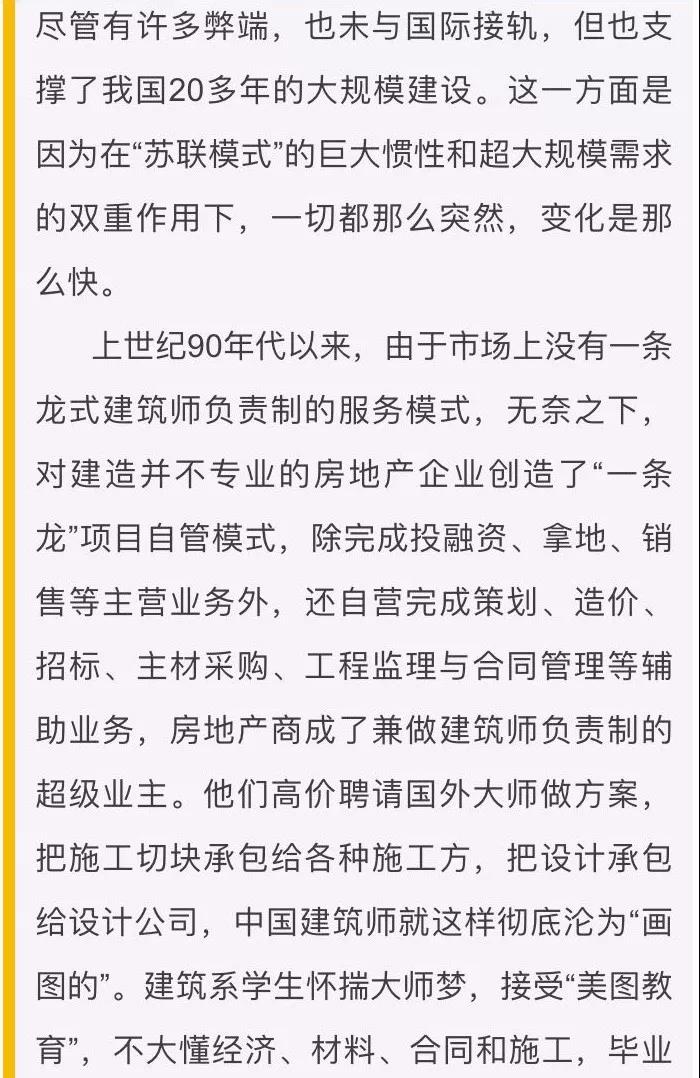 受“蘇聯(lián)模式”影響,我國(guó)建筑師長(zhǎng)期沿襲“建筑師就是畫圖的”的固有觀念,對(duì)從事造價(jià)、招標(biāo)、監(jiān)理、主材設(shè)備等全過(guò)程咨詢涉及較少,因而缺乏自信和主動(dòng),在實(shí)踐中逐漸被業(yè)主邊沿化。衷心希望設(shè)計(jì)企業(yè)(建筑師)破除迷信,轉(zhuǎn)變觀念,“回流”人才,勇于實(shí)踐建筑師負(fù)責(zé)制,就一定會(huì)實(shí)現(xiàn)“人員不變,產(chǎn)值翻倍”的經(jīng)營(yíng)目標(biāo)。
