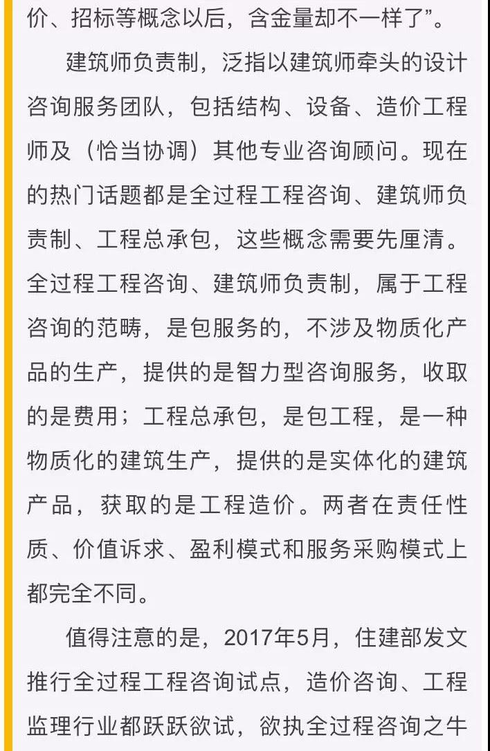當(dāng)前,國(guó)家大力推進(jìn)工程總承包,許多設(shè)計(jì)企業(yè)與施工企業(yè)聯(lián)合,從事工程總承包,但其中大部分是施工企業(yè)牽頭,設(shè)計(jì)企業(yè)實(shí)際上是施工總承包商的“設(shè)計(jì)分包”。這恰恰是因?yàn)椋O(shè)計(jì)企業(yè)沒(méi)有實(shí)行建筑師負(fù)責(zé)制,只有提供“畫圖”服務(wù)的能力,因而在工程總承包中缺乏話語(yǔ)權(quán),服務(wù)含金量不高。因此,筆者認(rèn)為,由于設(shè)計(jì)文件深度及工程造價(jià)、工程結(jié)算改革尚不配套,當(dāng)前在房屋建筑和市政工程領(lǐng)域推進(jìn)工程總承包的條件并不成熟,而應(yīng)首先大力推進(jìn)建筑師負(fù)責(zé)制,使設(shè)計(jì)企業(yè)首先具備全過(guò)程工程咨詢的能力,然后再創(chuàng)造條件推進(jìn)工程總承包。