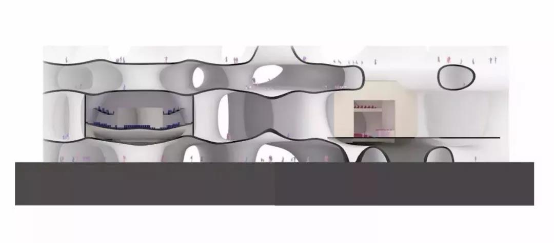 之所以突兀,就是因為這一空間并沒有使用“洞穴的”的結構體系,仍然是傳統的結構體系,這兩大塊就是劇場舞臺后部的幕塔空間,因為功能跨度等原因,心中充滿愛的伊東君也不得不向地球重力低頭。