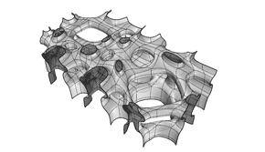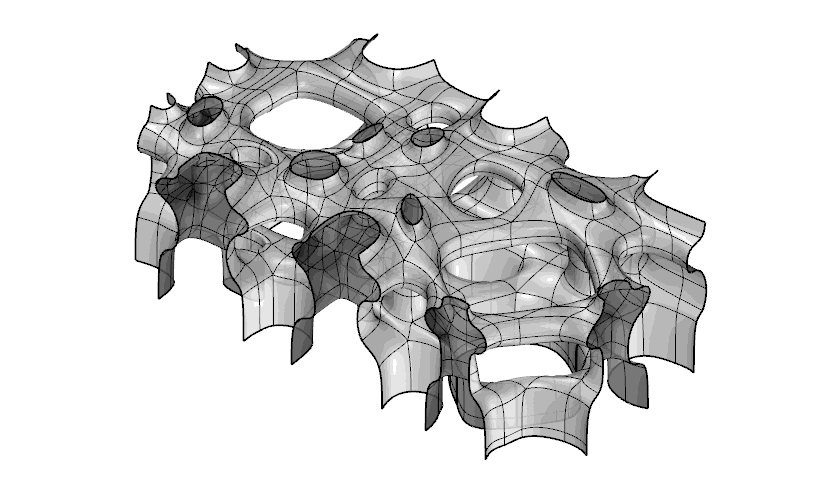 第三步,將原有位于不平面的管柱和樓板,通過曲面的方式,將原有的不同結構,融合在一個連續(xù)的三維曲面中。然后將這個單元塊,在兩個維度中復制并組合。
