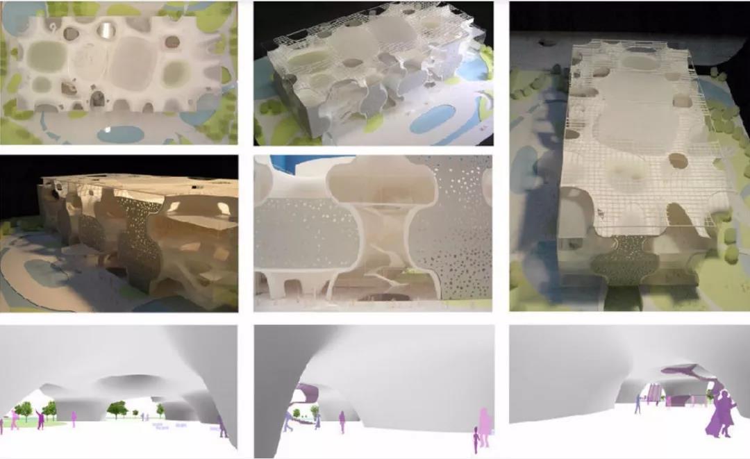 將若干個單元體系組合之后加以變化,就可以適應各種功能成為各種歌劇院或者圖書館。
