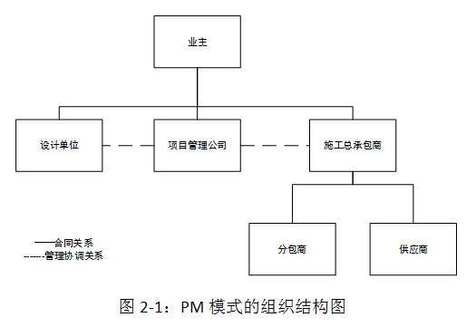 項目管理模式(PM: project management)是指工程項目管理企業(yè)接受業(yè)主的委托,按照合同的約定,代表業(yè)主對項目的組織實施進行全過程或若干階段的管理和服務。其職責范圍包括項目的決策階段的可行性報告的編制和項目策劃、招標代理、設計管理、采購管理和施工管理以及竣工驗收等服務。PM合同是委托合同,接受委托的工程項目管理企業(yè)代表業(yè)主對工程建設的質(zhì)量、安全、進度、成本、信息等要素進行管理和控制,按照合同約定收取一定的報酬和承擔一定的管理責任。PM模式的組織結構圖如下: