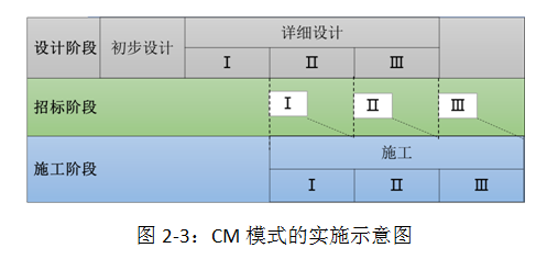 CM模式又稱階段發(fā)包模式(phased construction method)或快速軌道模式(fast track method)。最早起源于美國。這種模式下,業(yè)主委托具有施工經(jīng)驗的CM公司參與工程項目的設計階段,為設計公司提供施工方面的經(jīng)驗,保證設計的可施工性。CM公司和設計單位是合作關系。這種模式的出發(fā)點是采用“邊設計、邊發(fā)包、邊施工”的方式,盡可能的縮短項目的工期,當然,需要設計、招標和施工環(huán)節(jié)充分的銜接。CM模式的實施示意圖如下: