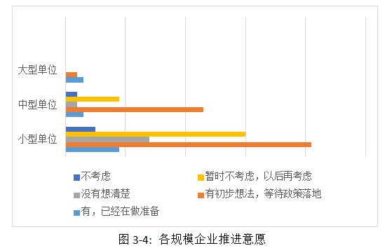 不同性質(zhì)的企業(yè)在推進(jìn)意愿上表現(xiàn)出一定的差異。全民營、國有、混合所有制企業(yè)中都有企業(yè)已經(jīng)有所想法,并已開始準(zhǔn)備,而事業(yè)單位主要持觀望態(tài)度,接受調(diào)研的事業(yè)單位全部都暫時(shí)不考慮,以后再考慮,這可能出于事業(yè)單位體制束縛,在外部資源整合方面缺乏靈活性的擔(dān)心,在目前政策還不完善的情況下,都選擇了觀望態(tài)度。同時(shí)作為本次調(diào)研企業(yè)主體的全民營企業(yè),在推進(jìn)全過程工程咨詢方面態(tài)度也是各有想法,近一半企業(yè)有初步想法,等待政策落地;其次,部分全民營企業(yè)選擇暫時(shí)不考慮,以后再考慮;少數(shù)全民營企業(yè)表示沒有想清楚;個別企業(yè)表示有意愿,已經(jīng)在做準(zhǔn)備。