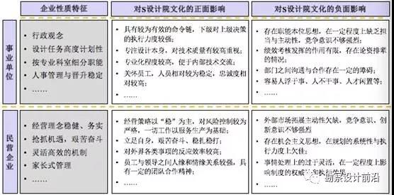 外部環(huán)境主要是從行業(yè)特征、企業(yè)性質、中國傳統(tǒng)文化與現(xiàn)代文化特征、地域文化特征等維度進行分析,以企業(yè)特征為例,事業(yè)單位及民營企業(yè)兩種企業(yè)性質對S設計院的企業(yè)文化產(chǎn)生的影響如下: