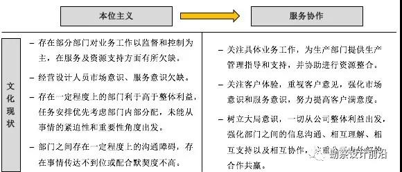 核心理念的總結與提煉,既是對傳統(tǒng)優(yōu)秀文化因素的繼承與發(fā)揚,又是對一些可能在當時的時代背景及企業(yè)運營現(xiàn)狀下能夠對企業(yè)發(fā)展起到一定作用、但隨著時代進步在提高公司號召力和凝聚力等方面逐漸弱化的文化因素的突破與創(chuàng)新。從Y設計院的實際情況來看,攀成德咨詢組認為Y設計院需要在發(fā)展模式、管理經(jīng)營、人才管理、工作狀態(tài)等四個方面實現(xiàn)企業(yè)文化的突破與創(chuàng)新。以管理經(jīng)營維度為例,Y設計院需要從本位主義向服務協(xié)助進行轉變。