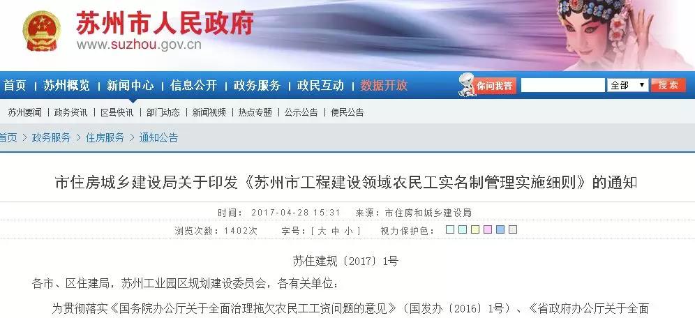 2017年4月28日,蘇州市印發(fā)《工程建設(shè)領(lǐng)域農(nóng)民工實名制管理實施細則》。