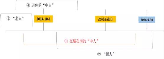 ①在職在編的“中人”,在2014年10月1日以前參加工作,改制基準(zhǔn)日后退休。