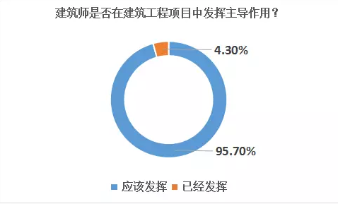 95.7%的人認為注冊建筑師應該在建筑工程項目中發(fā)揮主導作用,與之形成對比的是,僅有4.3%的人認為在當前的建筑工程中注冊建筑師已經(jīng)發(fā)揮了主導作用。這兩者之間巨大的差距,反映出建筑師內(nèi)心的訴求,也折射出建筑師負責制試點項目中,應給予建筑師更多的責權利,讓他們發(fā)揮更多,更重要的作用。