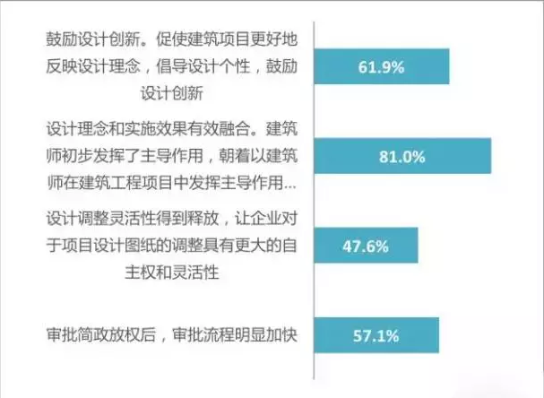 在建筑師負責制試點項目中,有81.0%的相關方認為通過試點項目,設計理念和實施效果有效融合。建筑師初步發(fā)揮了主導作用,朝著以建筑師在建筑工程項目中發(fā)揮主導作用的方向發(fā)展。有61.9%的相關方認為初步成效為促使建筑項目更好地反映設計理念,倡導設計個性,鼓勵設計創(chuàng)新。其次有57.1%認為審批簡政放權后,審批流程明顯加快。有47.6%認為設計調整靈活性得到釋放,讓企業(yè)對于項目設計圖紙的調整具有更大的自主權和靈活性。