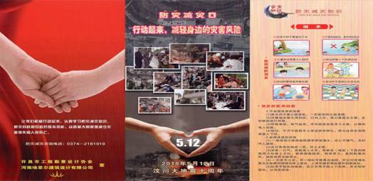 許昌市工程勘察設(shè)計(jì)協(xié)會(huì)黨支部在“5.12”全國(guó)防災(zāi)減災(zāi)日到來前,組織許昌市勘察設(shè)計(jì)單位進(jìn)行了深入持久的、全面的防震減災(zāi)科普知識(shí)宣傳教育工作,切實(shí)把防震減災(zāi)宣傳教育工作列入黨支部重要議事日程。