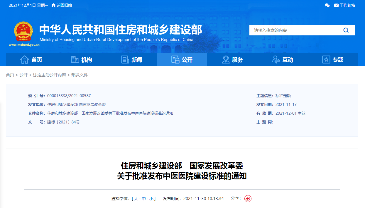根據(jù)《住房和城鄉(xiāng)建設部關(guān)于下達2012年建設標準編制項目計劃的通知》(建標〔2012〕192號),由國家中醫(yī)藥管理局組織編制的《中醫(yī)醫(yī)院建設標準》已經(jīng)有關(guān)部門會審,現(xiàn)批準發(fā)布,編號為建標106-2021,自2021年12月1日起施行。原《中醫(yī)醫(yī)院建設標準》(建標106-2008)同時廢止。