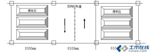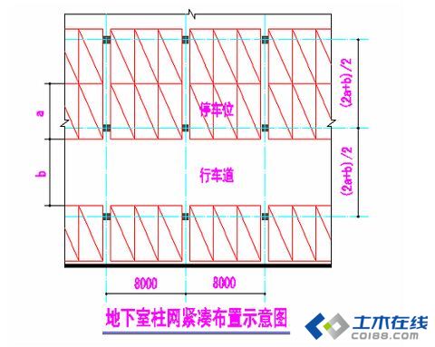 柱網(wǎng)按8000x(2a+b)/2布置。沿行車道方向柱距8000,垂直行