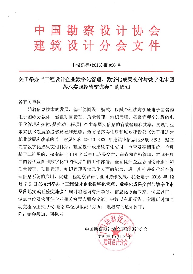 中國勘察設(shè)計協(xié)會建筑設(shè)計分會于2016年12月7-9日在杭州舉辦“工程設(shè)計企業(yè)數(shù)字化管理、數(shù)字化成果交付與數(shù)字化審圖落地實踐經(jīng)驗交流會”. 現(xiàn)將《關(guān)于舉辦“工程設(shè)計企業(yè)數(shù)字化管理“數(shù)字化成果交付與數(shù)字化審圖落地實踐經(jīng)驗交流會”的通知》(中設(shè)建字〔2016〕第036號文件)予以轉(zhuǎn)發(fā)。