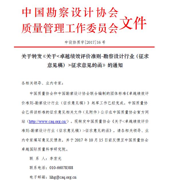 中勘協(xié)質(zhì)量管理委員會關(guān)于卓越績效評價準(zhǔn)則-勘察設(shè)計行業(yè)(征求意見稿)征求意見