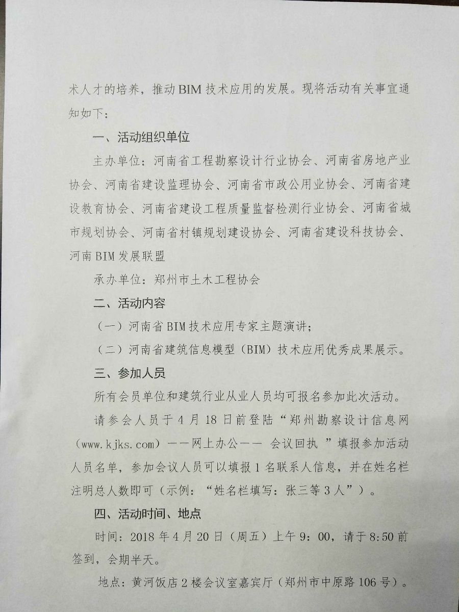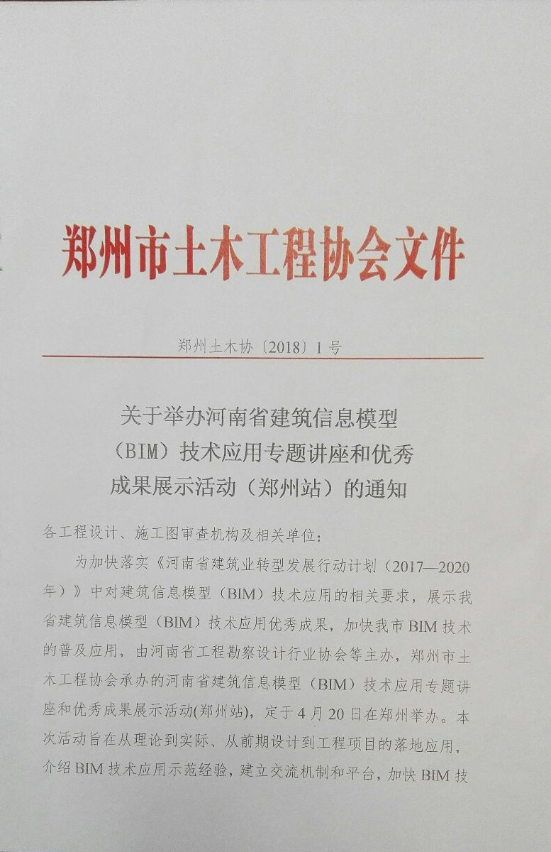 關(guān)于舉辦河南省建筑信息模型(BIM)技術(shù)應(yīng)用專題講座和優(yōu)秀成果展示活動(鄭州站)的通知
