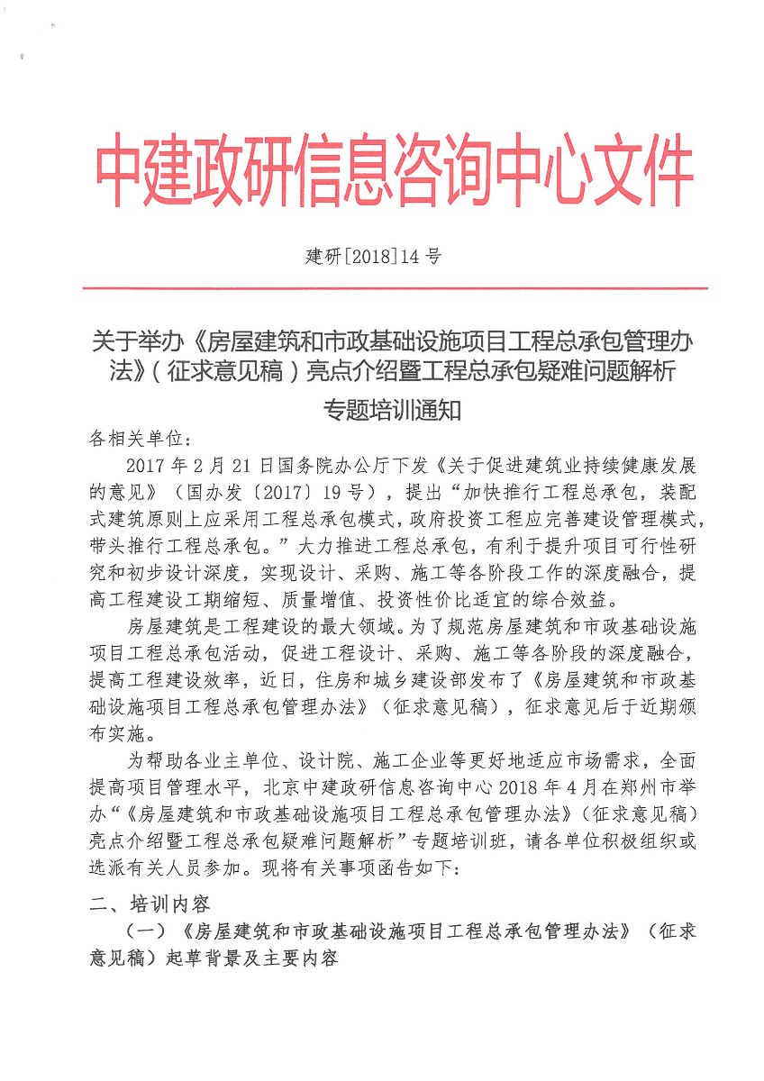 附件1:關(guān)于舉辦<房屋建筑和市政基礎(chǔ)項(xiàng)目工程總承包管理辦法>(征求意見(jiàn)稿)亮點(diǎn)介紹暨工程總承包疑難問(wèn)題解析專(zhuān)題培訓(xùn)通知