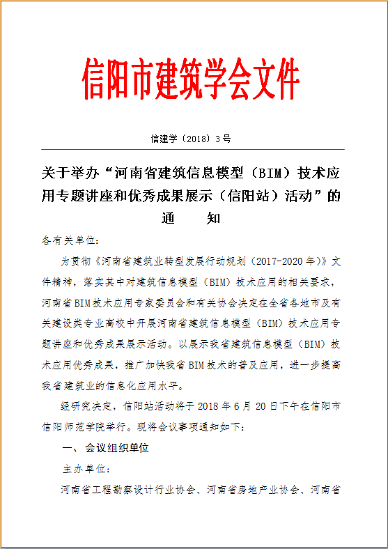 關(guān)于舉辦“河南省建筑信息模型(BIM)技術(shù)應(yīng)用專題講座和優(yōu)秀成果展示(信陽(yáng)站)活動(dòng)”的通知