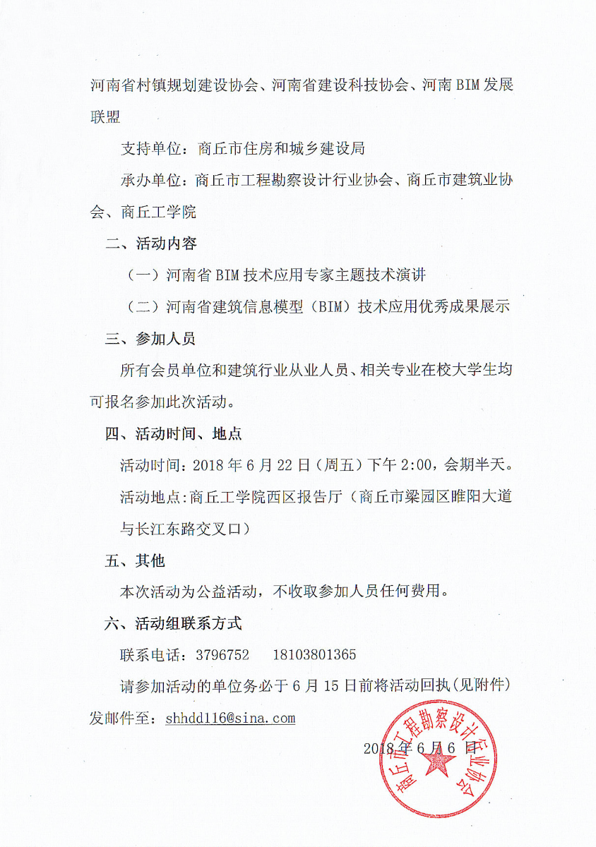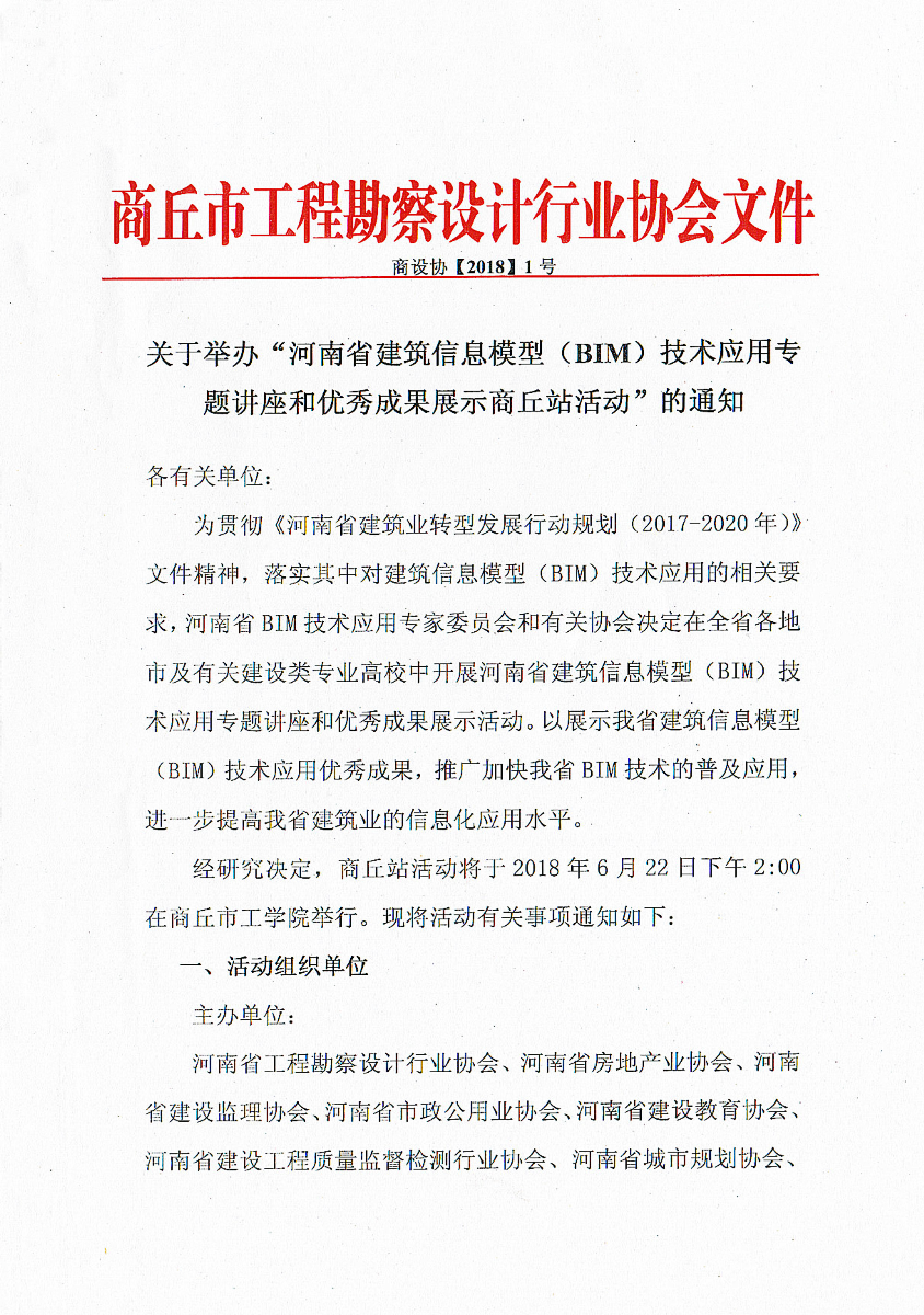 關(guān)于舉辦“河南省建筑信息模型(BIM)技術(shù)應(yīng)用專題講座和優(yōu)秀成果展示(商丘站)活動”的通知