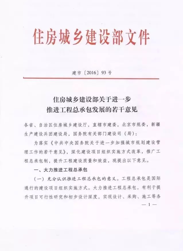2016年5月20日,住建部發(fā)布了《關(guān)于進一步推進工程總承包發(fā)展的若干意見》(建市【2016】93號),《意見》肯定了工程總包項目模式的積極意義和重要性,倡導政府投資項目和裝配式項目積極采用工程總承包模式,并從推動工程總承包行業(yè)發(fā)展方面提出了相關(guān)的優(yōu)化建議(后附全文),以下是重點解讀。