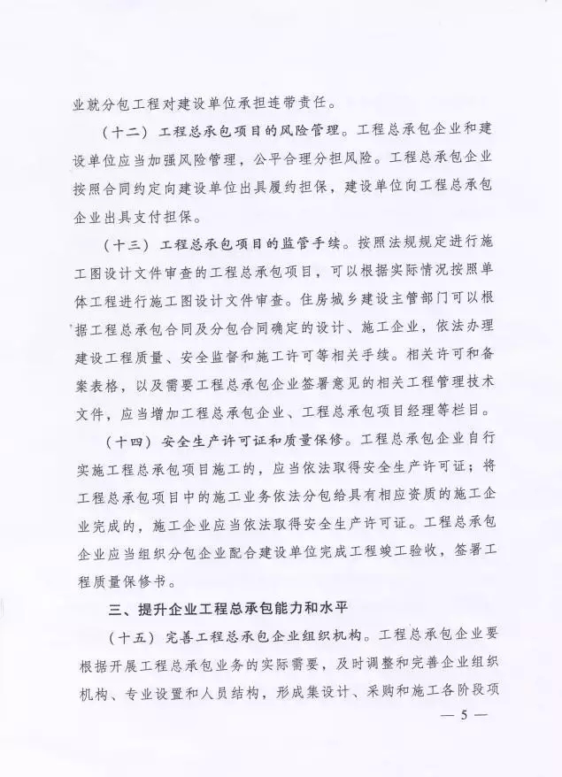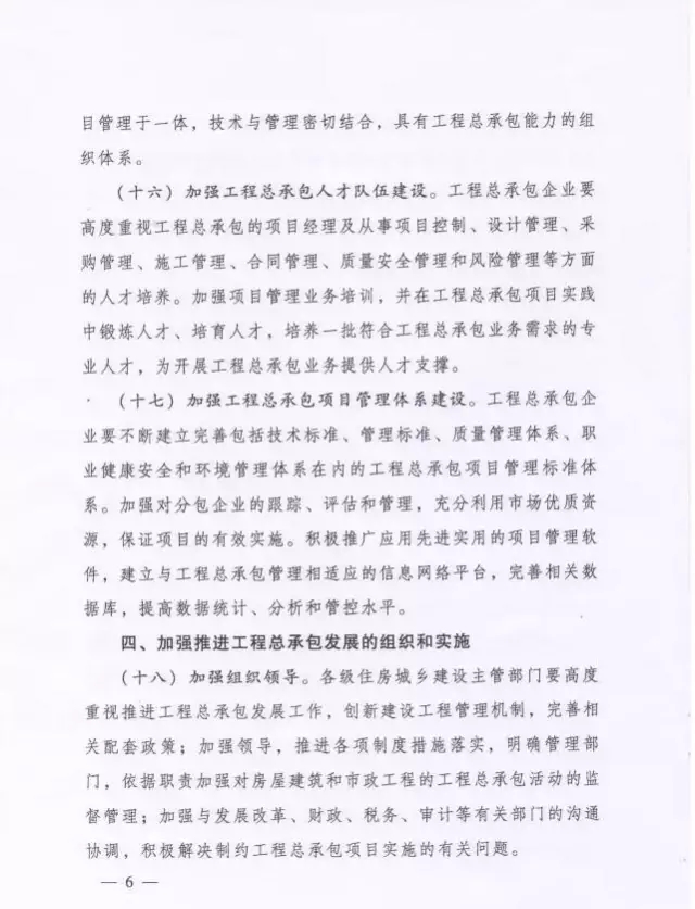 在發(fā)展過程中,市場上一度出現(xiàn)只要是具有相應(yīng)資質(zhì)都可參與總承包項目投標,但是這些單位在中標后,組織架構(gòu)、人員配置和管理體系卻無法滿足業(yè)務(wù)開展的需要,項目無法順利推進,同時給主管部門及一些建設(shè)單位造成了工程總承包模式的誤解,所以《意見》指出:工程總承包企業(yè)除了要求具備相應(yīng)資質(zhì)外, 還需具有相應(yīng)的財務(wù)、風險承擔能力,同時具有相應(yīng)的組織機構(gòu)、項目管理體系、項目管理專業(yè)人員和工程業(yè)績。同時,還需不斷建立完善包括技術(shù)標準、管理標準、質(zhì)量管理體系、職業(yè)健康安全和環(huán)境管理體系在內(nèi)的工程總承包項目管理標準體系。