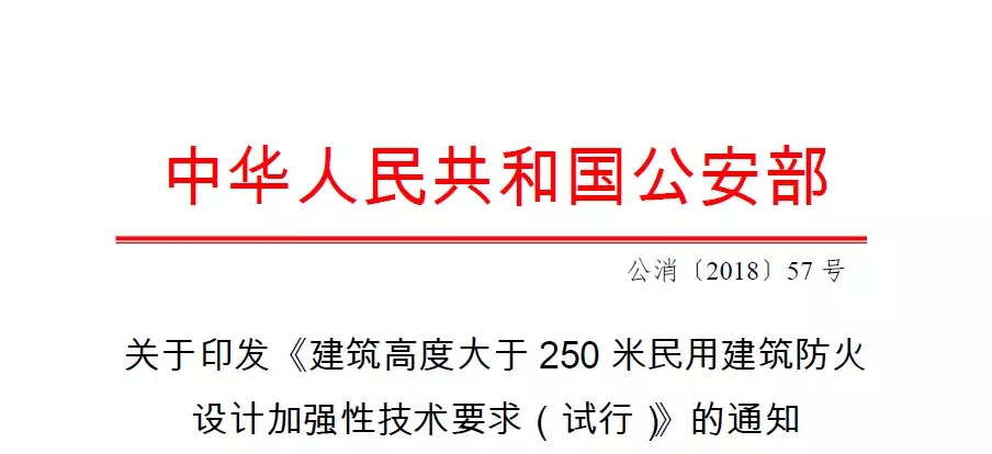 4月10日,公安部消防局發(fā)布關(guān)于印發(fā)《建筑高度大于250米民用建筑防火設(shè)計加強性技術(shù)要求(試行)》的通知,即日起施行。