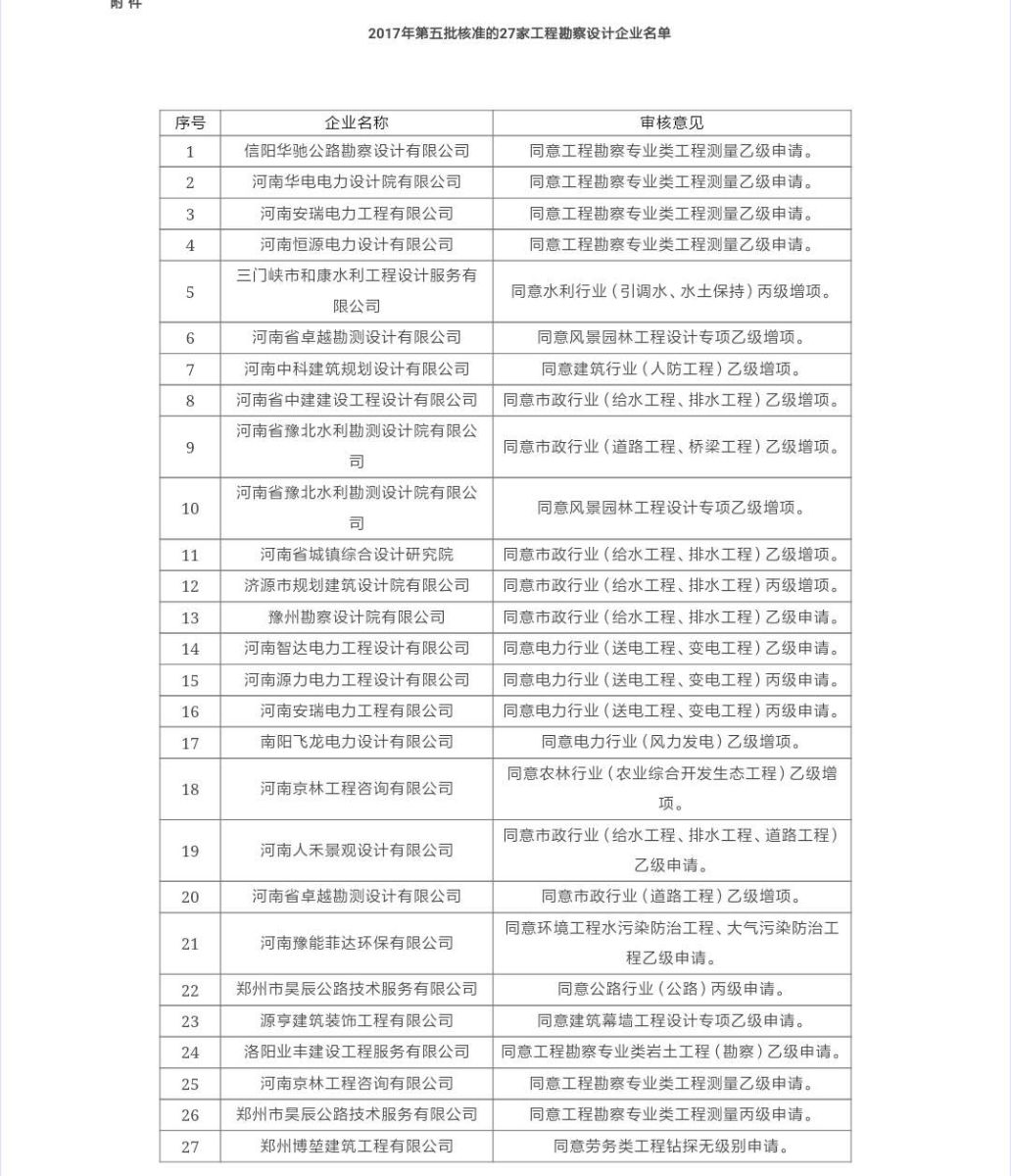 附件:2017年第五批核準(zhǔn)的27家工程勘察設(shè)計(jì)企業(yè)名單