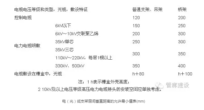二、電(光)纜的支架層間間距,應(yīng)滿足電(光)纜敷設(shè)和固定的要求,且在多根電(光)纜同置于一層支架上時,應(yīng)有更換或增設(shè)任意電(光)纜的可能。電(光)纜支架層間垂直距離宜符合下表規(guī)定的數(shù)值。