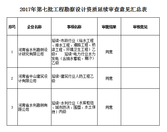 按照《行政許可法》及有關(guān)建設(shè)工程企業(yè)資質(zhì)管理規(guī)定,經(jīng)企業(yè)申報,我廳組織專家對受理的3家工程勘察設(shè)計(jì)單位資質(zhì)延續(xù)的申報材料進(jìn)行審查,現(xiàn)將專家審查意見在河南省住房和城鄉(xiāng)建設(shè)廳網(wǎng)站(http://www.hnjs.gov.cn/)予以公示。請有關(guān)主管部門通知企業(yè)查閱。