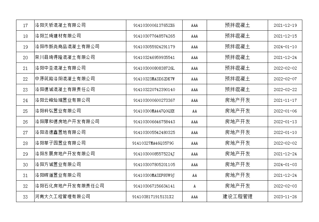 洛陽市住房和城鄉(xiāng)建設局2021年第一批企業(yè)信用等級公示